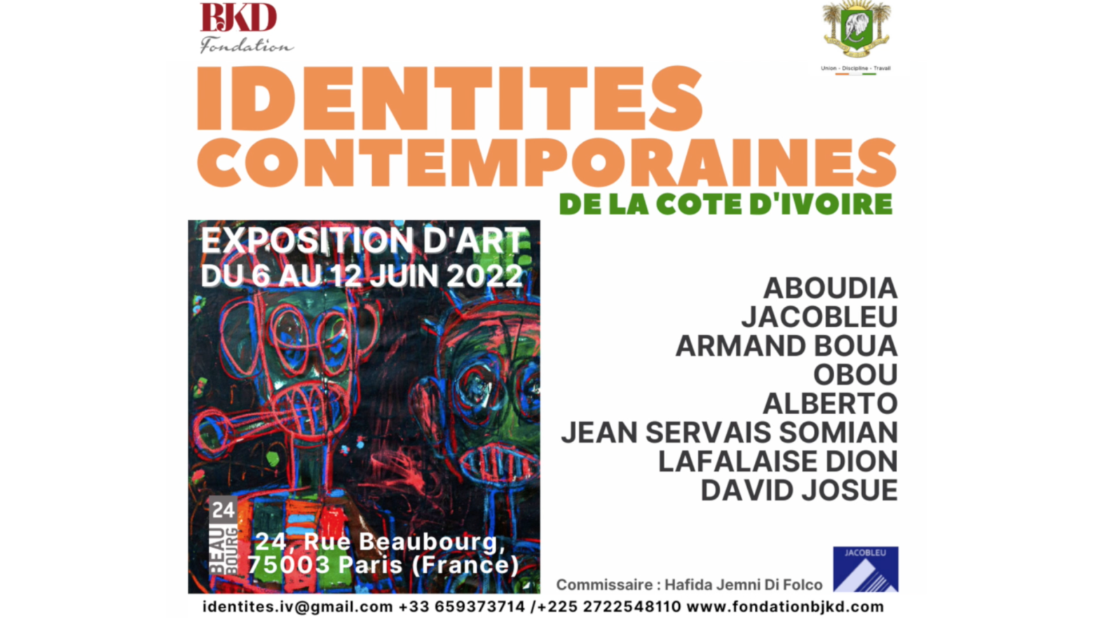 Organisée par la Fondation BKJD, l’exposition intitulé “Identités contemporaines de la Côte d’Ivoire” a lieu à Paris à la galerie 24 Beaubourg” du 06 au 12 juin 2022. À l’honneur, sept artistes ivoiriens à la renommée grandissante : Jacobleu, Obou, Aboudia, Alberto, Lafalaise Dion, Jean Servais Somian et David Josue.