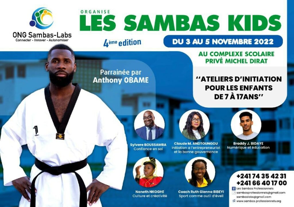 Pour la quatrième année consécutive, l’ONG Sambas Labs organise les Sambas kids. Du 03 au 05 novembre, les enfants de 7 à 17 ans assisteront à des ateliers d’initiation au complexe scolaire Michel Dirat à Libreville. Sous le parrainage du vice-champion Olympique, champion du monde, champion d’Afrique et unique médaillé olympique gabonais de taekwondo, Anthony Obame, les enfants pourront… Poursuivre la lecture LANCEMENT DE LA QUATRIÈME ÉDITION DES SAMBAS KIDS AU GABON
