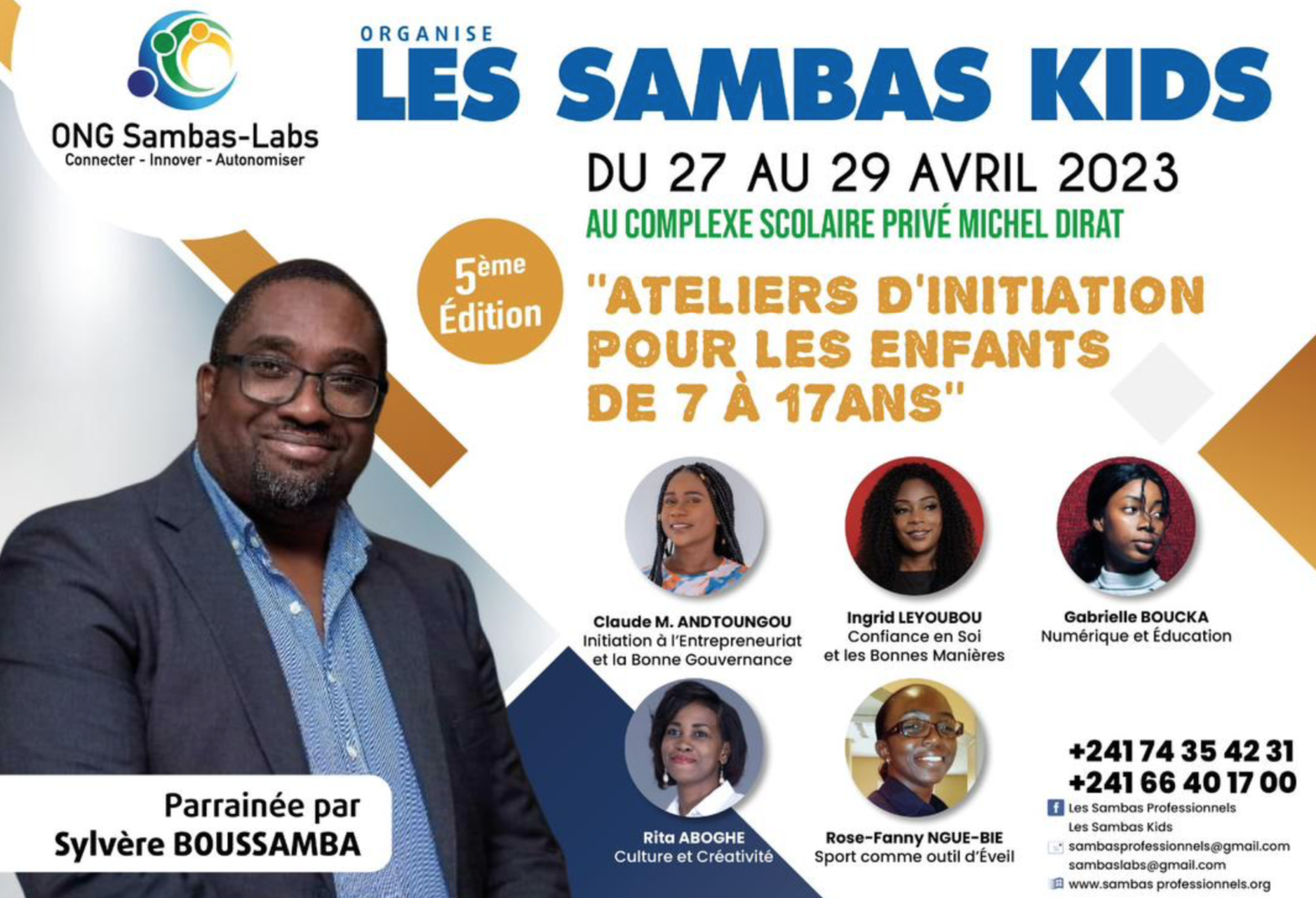 Du 26 juin au 1er juillet 2023 se tiendra la 9ème édition des Sambas Professionnels à Libreville au Complexe Scolaire Privé Michel Dirat, sous le parrainage du Dr. Massamba Gueye. Les inscriptions sont ouvertes alors n’hésitez pas à contacter l’ONG Samba-Labs si vous souhaitez participer à cette semaine riche en partage et en rencontres. Dix… Poursuivre la lecture DES PROFESSIONNELS INTERNATIONAUX SE METTENT AU SERVICE DE LA JEUNESSE GABONAISE